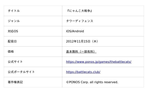 『にゃんこ大戦争』は、iOS・Android向けタワーディフェンスゲームです。プレイヤーは様々な能力を持つ「にゃんこ」たちを編成して、各地を侵略していきます。2012年のリリース以来、個性的なキャラクターや独特の世界観が、日本のみならず世界中の多くのお客様にご支持をいただいています。今後も多様なメディア展開やコラボレーションを積極的に行ってまいります。