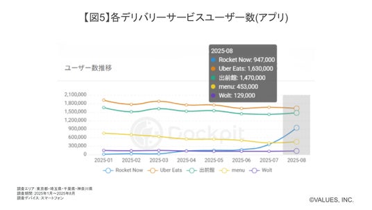 2025年1月から見ると、Rocket Now以外のアプリユーザー数は全体的に減少しており、フードデリバリー業界全体が停滞・縮小傾向にあることがわかります。Rocket Nowは2025年7月から急激にユーザー数が増加していますが、他のアプリのユーザー数には大きく影響していないと言えそうです。