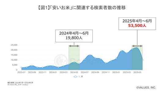 4月~6月における検索者数を2025年と2024年で比較すると、その数は1年間で約2.7倍に増加しています。価格高騰を受け、安いお米に対する関心が高まっていることがわかります。