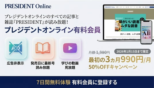 - 広告非表示で快適な閲覧体験を有料会員限定で閲覧画面の一部を専有していた広告が非表示になり、画面全体を記事閲覧にご利用いただけます。- 雑誌『プレジデント』が読み放題プレジデント誌の発売日に、最新号の記事が「プレジデントオンライン」のスタイルで読み放題に。誌面の臨場感をそのまま楽しめる「ビューワー形式」でもご提供します。また、2018年以降のバックナンバーおよび非売品の特典書籍の電子版もご覧いただけます。※バックナンバーの一部および特典書籍の電子版はビューワー形式のみの対応となっております。