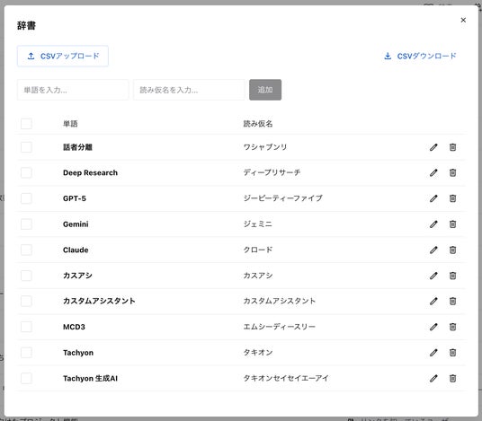 - 読み仮名入力機能の追加: 辞書登録UIに読み仮名を入力できるようになりました。特殊な読み方の単語や、略語をより正確に認識し、議事録の精度がさらに向上しました。
