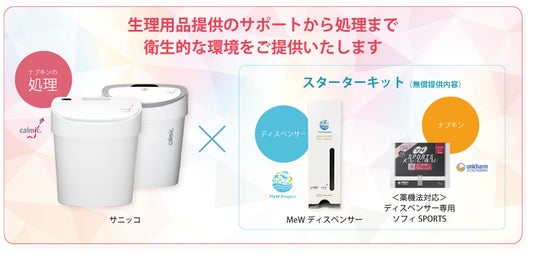日本カルミック株式会社(代表取締役社長:高居 隆章、以下「日本カルミック」)は、タッチレスサニタリーボックス『サニッコ(R)』をご契約いただいた学校施設に、薬機法対応の完全密閉型ナプキン(『ソフィSPORTS羽根つき』)と、生理用品ディスペンサー『MeW ディスペンサー』※2をセットにしたスターターキットを一部無償提供します。