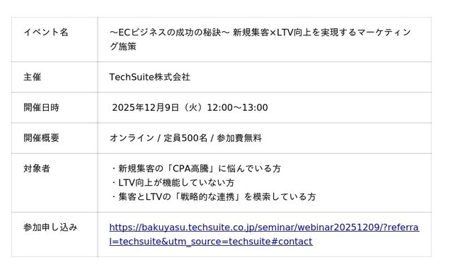 TechSuite株式会社(テックスイート/代表取締役: 畠山夏輝)は、2025年12月9日(火)に共催ウェビナー「~ECビジネスの成功の秘訣~ 新規集客×LTV向上を実現するマーケティング施策」を開催します。