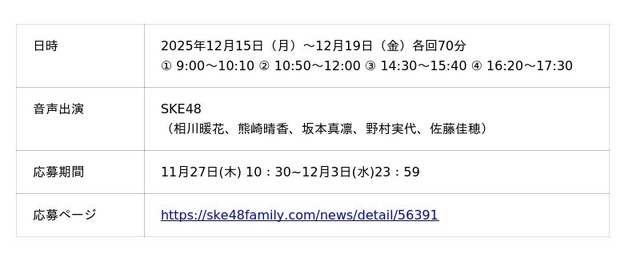 本実証実験では、地元アイドル「SKE48」や「BOYS AND MEN」の音声ガイドとともに、名古屋駅を発着点とした主要観光地を約30分かけて巡ります。参加者は、まるで“推し”と一緒に旅しているかのような臨場感あふれる音響体験と、最新のモビリティ技術を同時に体感できます。応募は事前抽選制(応募期間:11月27日(木)10:30~12月3日(水)23:59、参加費無料)で、当選者のみご参加いただけます。本取り組みを通じて、地域の魅力発信と新たな観光体験の創出をめざします。