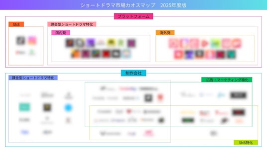 このような状況を踏まえ、AdLinkでは、2025年度のショートドラマ市場のプレイヤーを分類したカオスマップを作成しました。