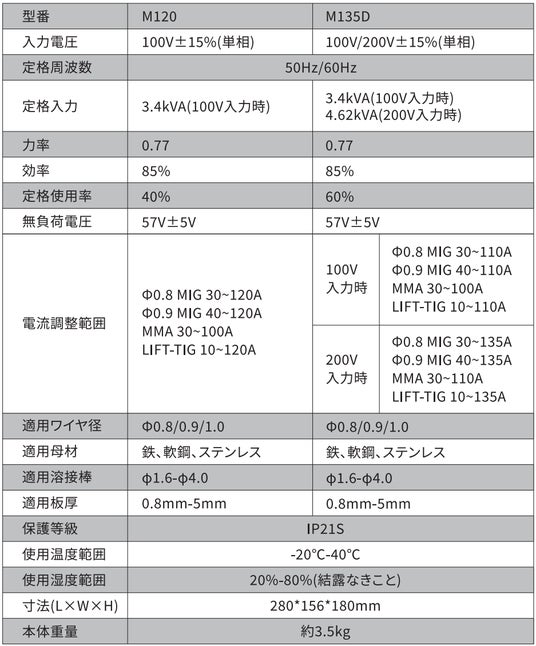 M120は100V入力で最大約5mmまでの溶接に対応。M135Dは100V/200Vの両電源に対応し、最大約8mmまで溶接可能で、よりパワフルな作業に適しています。