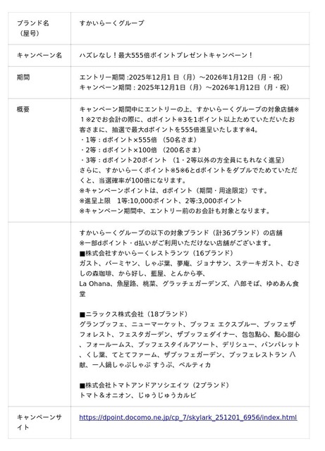 本キャンペーンへの参加にはエントリーが必要で、キャンペーンサイトからエントリーの上、すかいらーくグループの対象店舗※1※2でお会計の際に、dポイント※3を1ポイント以上ためたお客さまに、抽選で最大dポイント(期間・用途限定)を555倍進呈いたします※4。 さらに、すかいらーくポイント※5※6とdポイントをダブルでためていただくと、当選確率が100倍になります。詳細はキャンペーンサイトにてご確認ください。