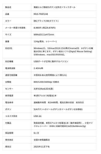 ナカバヤシ株式会社(本社:大阪市中央区、社長:中林一良)は手首のねじれを軽減する「無線エルゴ静音5ボタン光学式トラックボール」を全国で2025年11月(下旬)より発売します。