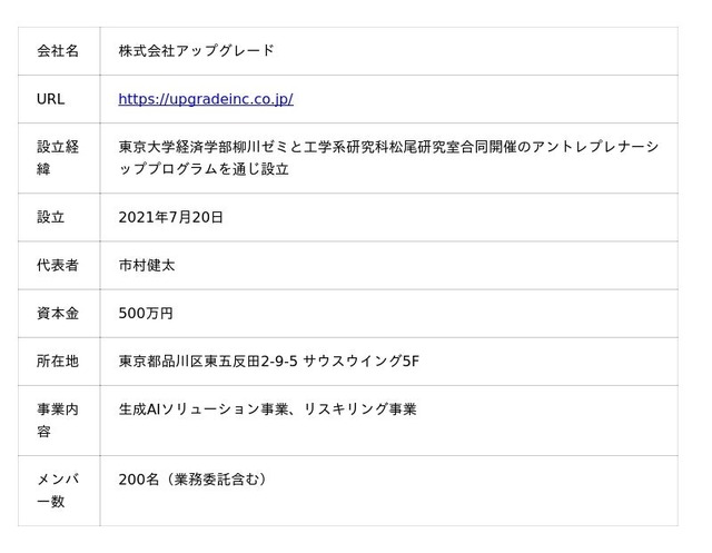 株式会社アップグレードは、「労働生産性革命」をミッションとし、生成AIソリューション事業およびリスキリング事業を提供しています。生成AIソリューション事業では、お客様の業務課題分析から生成AIを活用したシステムの企画・開発・導入、そして運用支援に至るまで、伴走型で一気通貫支援しております。