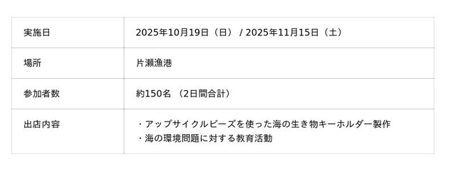 大和ハウスグループの株式会社コスモスイニシア(本社:東京都港区、社長:高智 亮大朗)は、湘南・鎌倉エリアで展開するリノベーションマンションシリーズ「海プロジェクト」の一環として、地域イベントに出店し、無料でアップサイクルビーズを使ったキーホルダーづくり体験の場を提供しました。逗子市民まつりおよび江の島フィッシャーマンズマルシェ(2回開催)の3回のイベントにおいて、計350名以上の方々にご参加いただき、地域住民の皆さんが楽しみながら環境問題に触れ、「自分ごと」として考えるきっかけを創出しました。2020年から開始した本プロジェクトは、きれいな海と豊かな暮らしを次世代につなぐことを目指し、ビーチクリーン活動や資源のアップサイクル、環境教育活動の幅を拡大しています。