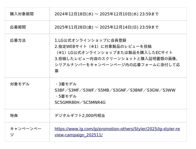 本キャンペーンでは、対象期間内に衣類ケア家電「LG Styler(TM)」をLG公式オンラインショップまたはLG指定販売店でご購入のうえ、当社が指定するWEBサイトに製品レビューを投稿いただくと、もれなくデジタルギフト2,000円相当をプレゼントします。