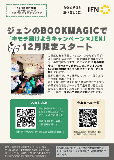 認定NPO法人ジェン(東京都港区、代表理事:桑原香苗、以下「ジェン」)は、2025年12月1日から31日の「寄付月間」にあわせ、読み終えた本やCD・DVDなどを活用して気軽に国際協力に参加できる「キモチ届けようキャンペーン×JEN」を開始します。
