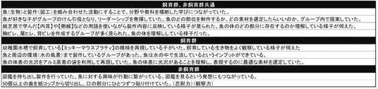 また、STEAM教育の科学、技術、芸術という観点で見ると、科学(Science):生物として魚を考える(ウロコ、ヒレ等の意義を理解)、生命について興味をもつ、技術(Technology):魚を育成するための技術を学ぶ、芸術(Art):魚を表現するためにいろいろな素材を応用する。色や形などを工夫して表現する。という様子が確認されました。子どもたちが紙芝居や観賞魚飼育を通じてインプットした知識を使い、製作活動というアウトプットが可能になっていると考えられます。