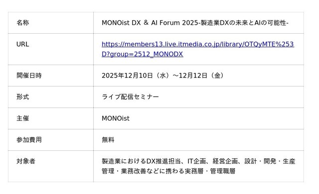 アイティメディア株式会社(本社:東京都千代田区、代表取締役社長 兼 CEO:小林教至、以下アイティメディア)は、2025年12月10日(水)~12月12日(金)に「MONOist DX & AI Forum 2025」を開催します。「MONOist DX & AI Forum」は「MONOist」主催のオンラインセミナーで、3回目となる2025年は「DXとAIの融合」に焦点を当てて開催します。AIの本格活用だけでなく、AI活用に備えた土台作りを意識し、「工場DX」「本当に使えるERP」「できるところから始めるDX&AI」の3つの視点から、製造業が次に進むべき方向性と「現実的で実行可能な変革」を支援します。