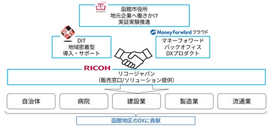 リコージャパン北海道支社、DIT、マネーフォワードの三社が連携・協力のもと、函館(道南地区)の自治体および企業のDXを推進し、地域社会の持続的な発展に寄与することを目的とします。