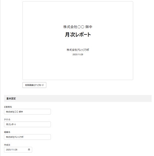 本機能では、背景画像の選択とテキストの設定によって、ブランドイメージに合った報告書の表紙を簡単に作成できます。