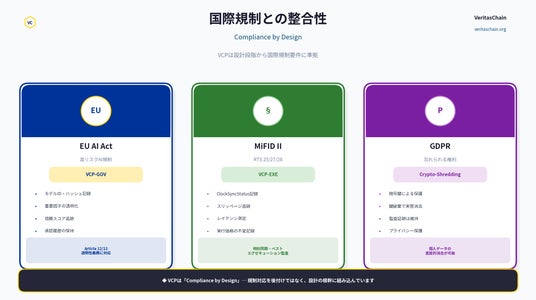 VCPは、従来の改ざん可能なサーバーログを“暗号証明に基づく監査証跡”に置き換え、監督当局・ブローカー・取引所・トレーディング企業が「信頼ベースの監督」から「検証ベースの監督」へと移行できる基盤を提供します。