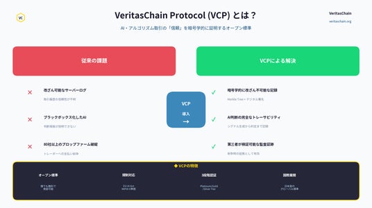 VeritasChain Standards Organization(VSO、日本発の国際標準化団体)は、AI駆動型およびアルゴリズム取引システムに対し、数学的に証明可能な透明性を提供する暗号学的監査プロトコル「VeritasChain Protocol(VCP)v1.0」のグローバルリリースを発表しました。