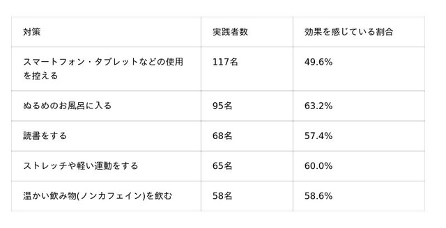 デジタルデバイスの使用抑制や入浴、運動など、一般的に知られる対策が上位を占めています。