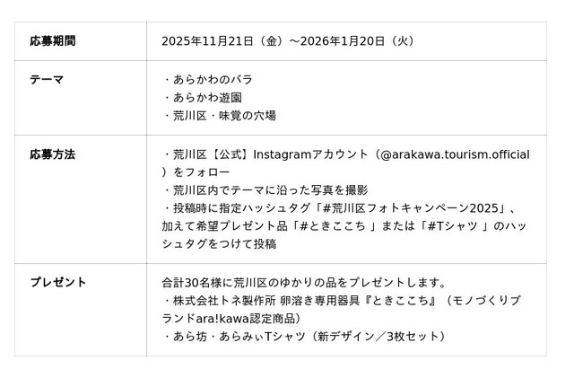荒川区では、区の魅力をより多くの方に知っていただくため、公式Instagramを活用した「フォロー&いいねキャンペーン」および「フォトキャンペーン」を実施します。抽選で素敵なプレゼントが当たるチャンスとなっています。ぜひご参加ください。