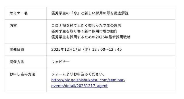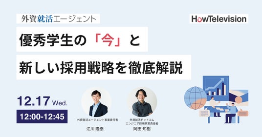 株式会社ハウテレビジョン(本社:東京都港区、代表取締役:音成洋介)は、新卒紹介事業の外資就活エージェントにおいて、優秀学生の「今」と新しい採用の形を徹底解説するセミナーを2025年12月17日(水)に初開催いたします。新卒採用を実施・検討している人事の方や採用に関わる方にむけて、外資就活エージェントの実績・事例やエンジニア採用支援事業の取り組みをもとにした新卒採用の新たなトレンドをご紹介します。