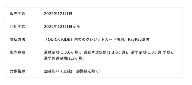 レシップホールディングス株式会社(本社:岐阜県本巣市、代表取締役社長:杉本 眞)の連結子会社レシップ株式会社(本社:岐阜県本巣市、代表取締役社長:北野 元昭)は、加越能バス株式会社(本社:富山県高岡市、代表取締役:松井 康浩)において、スマホ乗車券アプリ「QUICK RIDE」を導入し、2025年12月1日より「定期券」「回数券」の取扱いを開始します。