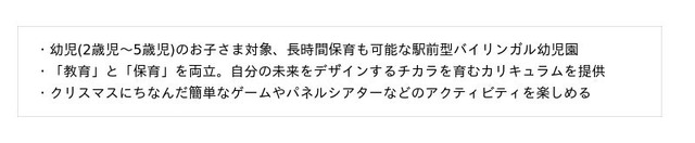 - 英会話、知能、運動、ライフスキル、プログラミングの5つのスキル教育と月に1回の発表会を実施することによって、インプットとアウトプットを循環させ「考える力」「表現する力」をバランスよく伸ばす