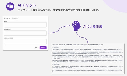 先行導入している永井病院(三重県津市、199床)および関連施設での実証において、以下の劇的な効果が確認されています。- 看護サマリー作成業務の効率化: 従来、電子カルテの情報を参照しながらゼロから作成していた看護サマリーに対し、AIが叩き台を作成することで、作業時間を合計で80%削減することに成功しました。