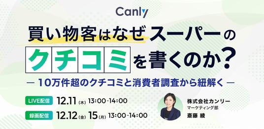 Google ビジネスプロフィール、Yahoo!プレイス、Appleマップなどの3大地図媒体、HP、アプリ、SNSなどの店舗集客媒体の一元管理サービス「カンリー店舗集客」の開発・提供を行う株式会社カンリー(所在地:東京都品川区、代表取締役:辰巳 衛,秋山 祐太朗)は2025年12月11日(木)・12日(金)・15日(月)13時よりスーパー業界向けセミナー【買い物客はなぜスーパーの"クチコミ"を書くのか…?~10万件超のクチコミと消費者調査から紐解く顧客心理と、サービス向上のヒント~】をオンライン開催いたします。