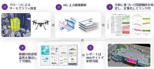 カーボンニュートラル社会の実現に向けて、建物が消費するエネルギーの削減は、重要な要素であり、そのCO2排出量は全体の40%に達するとの試算があります。また、その建物が消費するエネルギーのうち30%は、建物の外皮(壁、窓、屋上、ドア)から損失しています。しかしながら、建物外皮の課題解決をするためには、原因の特定や修繕の費用対効果を明確にする必要があり、その手法に関するコストが高く、現状は普及が進んでいません。欧米では、伝統的な建物をそのまま活用している事例が多く、リノベーション工事の投資効果を検証する技術が進んでいますが、QEA TECHの監査技術は、ドローンによる建物外観撮影データで実施可能なため、従来の方法より低コストで、建物の運用を妨げることなく、効果的な工法を提案することが可能であり、すでに700棟以上の監査実績を実証してきました。