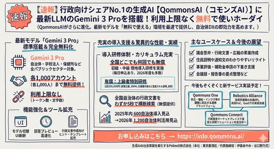 生成AIの社会実装を牽引するPolimill株式会社(本社:東京都港区/代表取締役:伊藤あやめ・谷口野乃花)は、自治体向け生成AI『QommonsAI(コモンズAI)』に最新モデル「Gemini 3 Pro」を標準搭載し、自治体や学校法人、保健所など全パブリックセクターで各1,000アカウント(各1,000人)までの無料提供をします。もちろんトークン数(文字数)などの利用上限はありません。