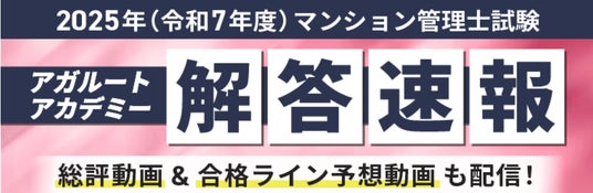 アガルートアカデミーは2025年度(令和7年度)マンション管理士試験の試験当日に「解答速報」 「総評」「合格ライン・合格点予想」YouTubeLIVE配信を会員登録不要で無料公開いたします。