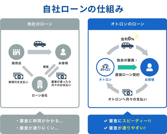オトロンが提供する「自社ローン」は、信販会社を介さず、同社とお客様の間で直接分割払い契約を行う仕組みを採用しています。