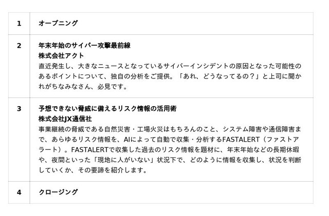 本ウェビナーでは、「アクト」のサイバーセキュリティ専門家と、24時間365日体制で災害・リスク情報を報道機関に提供している「JX通信社」が協力し、年末年始に注意すべきポイントや、無事に休暇を過ごすための最終チェックリストをご紹介します。