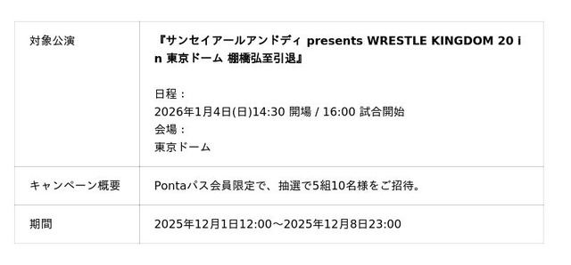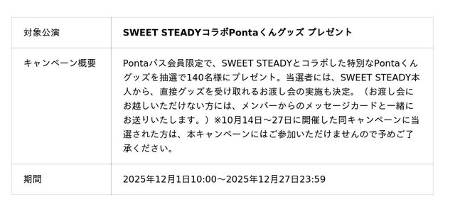 また、全席種が即完売し急遽増席分の販売が発表され話題なっている『サンセイアールアンドディ presents WRESTLE KINGDOM 20 in 東京ドーム 棚橋弘至引退』のご招待や、人気テレビ番組「シナぷしゅ」の5周年を記念したイベント『ぷしゅソングフェス 2025 ~うたって♪おどって!シナぷりちゃんパーティー~』のPontaパス会員限定の先行申し込み、KAWAII LAB.所属のアイドルグループ・SWEET STEADYとコラボした特別なPontaグッズのプレゼントキャンペーンなど、様々な会員限定キャンペーンを実施します。今後も、お客さまが「Pontaパスに入っていてよかった」「使っていてよかった」と思っていただけるような、さまざまなサービスやコンテンツを提供していきます。