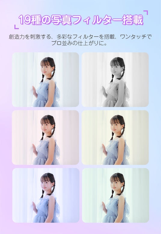 多彩な写真フィルタを標準搭載しており、運動会、卒業式、旅行、イベント、忘年会など、幅広いシーンで撮影の幅を広げます。初心者でもプロのような雰囲気ある写真を簡単に楽しめるのも特長です。