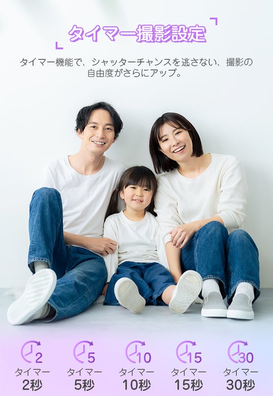 デジカメには、2秒/5秒/10秒/15秒/30秒の多段階タイマー撮影機能を搭載。集合写真や家族写真でも、誰かがシャッターを押す必要がなく、みんなで安心して写り込むことができます。