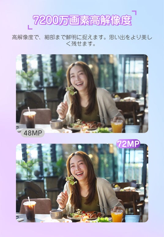 5K動画撮影では細部の質感まで鮮明に記録でき、7200万画素の高精細静止画は旅行やイベント、風景、人物などを一生ものの思い出として残せる高画質で撮影できます。