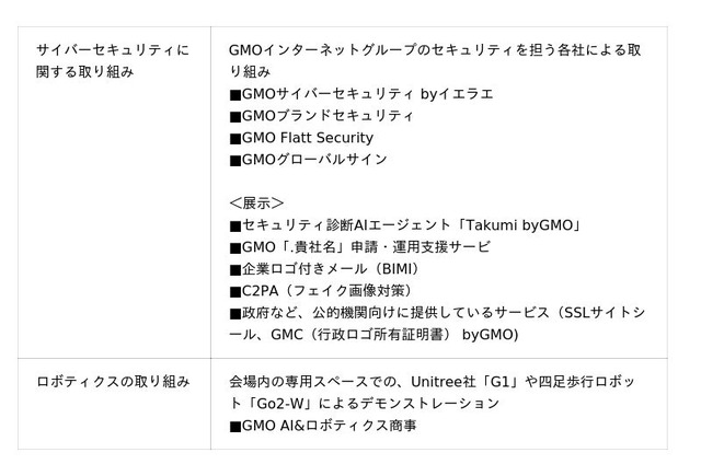 GMOインターネットグループは、出展ブースにおいて、サイバーセキュリティに関する最先端の取り組みのご紹介のほか、Unitree社「G1」や四足歩行ロボット「Go2-W」によるデモンストレーションを実施します。