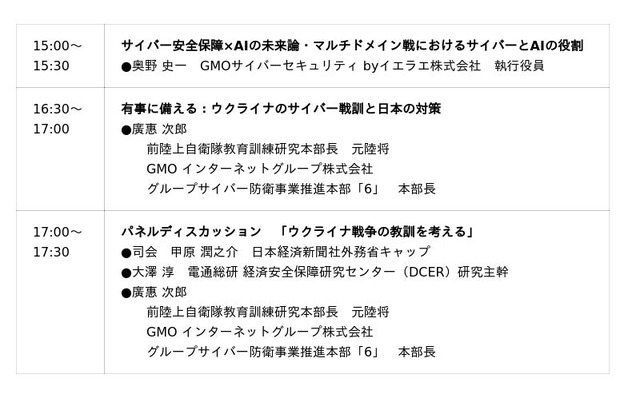 また、メインステージでは、前陸上自衛隊教育訓練研究本部長 元陸将 GMOインターネットグループ グループサイバー防衛事業推進本部「6」本部長 廣惠 次郎と、GMOサイバーセキュリティ byイエラエ株式会社 執行役員 奥野 史一による講演を予定しております。