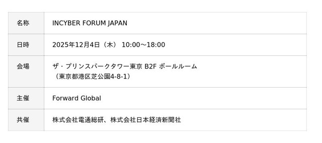 GMOインターネットグループ(グループ代表:熊谷正寿)は、2025年12月4日(木)にザ・プリンスパークタワー東京(東京都港区)で開催される「INCYBER FORUM JAPAN」(主催:Forward Global/共催:株式会社電通総研、株式会社日本経済新聞社)に、トップスポンサーにあたる特別協賛として出展いたします。本フォーラムを通じて、日本の経済安全保障とサイバーセキュリティの強化に貢献し、「すべての人に安心な未来を」を実現します。
