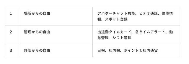 私たちは、現代社会が抱える3つの不自由(場所、管理、評価)を解消し、社員をストレスから解放することで、イノベーションを起こす企業が誕生する空間を実現していきたいと考えています。