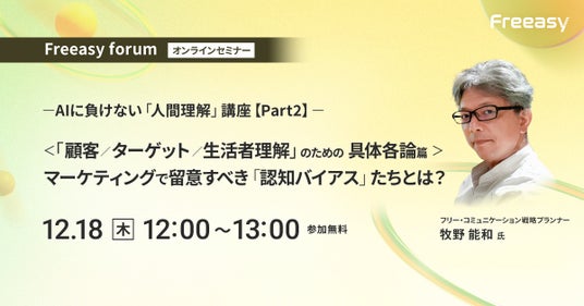 年間3万件以上の調査実績を誇る、国内最大級のセルフ型アンケートツール「Freeasy(フリージー)」を展開するアイブリッジ株式会社(本社:大阪市福島区、代表取締役社長:荒川和也)は、Freeasyオンラインセミナー『-AIに負けない「人間理解」講座【Part2】-<「顧客/ターゲット/生活者理解」のための具体各論篇>マーケティングで留意すべき「認知バイアス」たちとは?』を、2025年12月18日(木)12時から開催いたします。