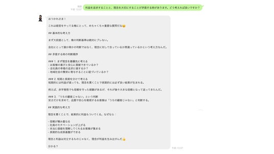 - 中小企業の持続的成長を支援 - 単なる業務効率化を超え、社員の働きがいや心の支えとしても機能し、企業独自の競争優位性を保ちながら持続的成長を支援する「理念を生きた判断基準に変える」AIパートナーです。
