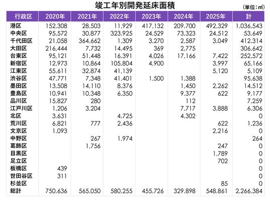 一方で、前述の開発件数で上位だった台東区や墨田区は延床面積では上位になっていません。エリアによって開発されるホテルの規模感が大きく異なることが分かります。