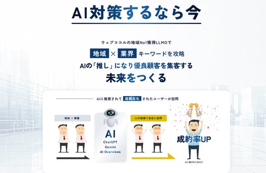 ウェブココル株式会社(本社:福岡県福岡市、代表取締役:杉岡玲生)は、Googleの「AI Overview」や「ChatGPT」や「Gemini」をはじめとする生成AI検索に対応し、地域ビジネスがAIからの引用・推奨を獲得するための新サービス「地域を制するLLMOコンサルティング」をリリースいたしました。 当社は東証グロース上場企業である株式会社デジタリフト(証券コード:9244)のグループ企業として、累計2,000万PV・記事制作8,500本以上の実績を持つSEOの知見をベースに、AI検索時代における企業の新たな集客チャネル構築を支援します。