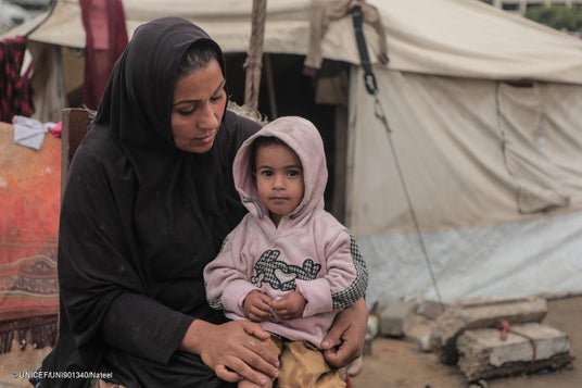 寝起きしているテントの中に雨水が浸水し、寒さに凍える娘を抱くマイサーさん。「これからの冬の季節をどうやって生きのびたらいいのか」と嘆く(パレスチナ、2025年11月14日撮影) (C) UNICEF/UNI901340/Nateel