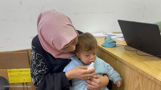 ユニセフとパートナーによる栄養状態の検査の結果、10月には急性栄養不良の5歳未満の子どもが約9,300人確認されました。これは9月の1万1,746人、8月の1万4,363人から減少しています。この減少傾向はガザの子どもの急性栄養不良の治療と予防に進展があることを示していますが、10月に治療を受けた子どもの数は依然として過去最多の水準にあり、前回の停戦期間中の2025年2月と比較すると約5倍に達しています。