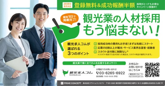 観光業界専門の総合コンサルティング会社、株式会社プライムコンセプト(本社:東京都千代田区、代表取締役:的場弘明)は、観光業界全体を対象とした特化型求人サイト「観光求人コム(https://kankokyujin.com/)」を2025年12月に正式に開設しました。旅行業、交通事業、DMOなど、観光に関連する幅広い業種を対象としています。