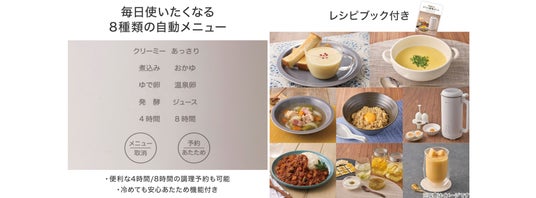 カレーやスープ、煮込み料理はもちろん、おかゆやゆで卵、豆乳、フルーツジュースやヨーグルトまで、これ1台で多彩なメニューが楽しめます。レシピブックも付属しており、バリエーション豊かな料理が簡単に作れます。